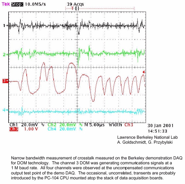 The cross talk of signals in the pairs of the same quad is comparable to the noise of the oscilloscope, setting a conservative limit of 60 dB S/N ratio. The spikes apparent on channel 1, 2, and 4 appeared to correlate with activity on the PC-104 CPU board inside the enclosure, adjacent to the testboards.